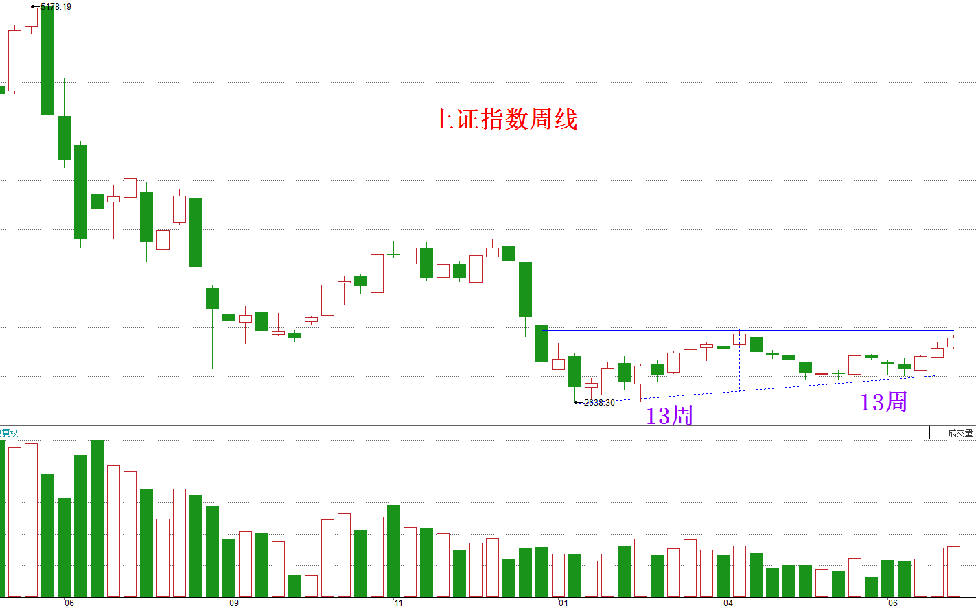 我们可以看到,以四月中旬的3097点为界,左边是十三周,右边也是十三周,对称性非常好。如果上证指数向上突破3097点,那么在周线图上就是个标准的大双底,而下周是最好的突破时机。万一接下来未能突破3097点而选择回落的话,则依然不改变现阶段处于底部阶段的本质,只是这个底部可能就要从双底变成三角形底部了。