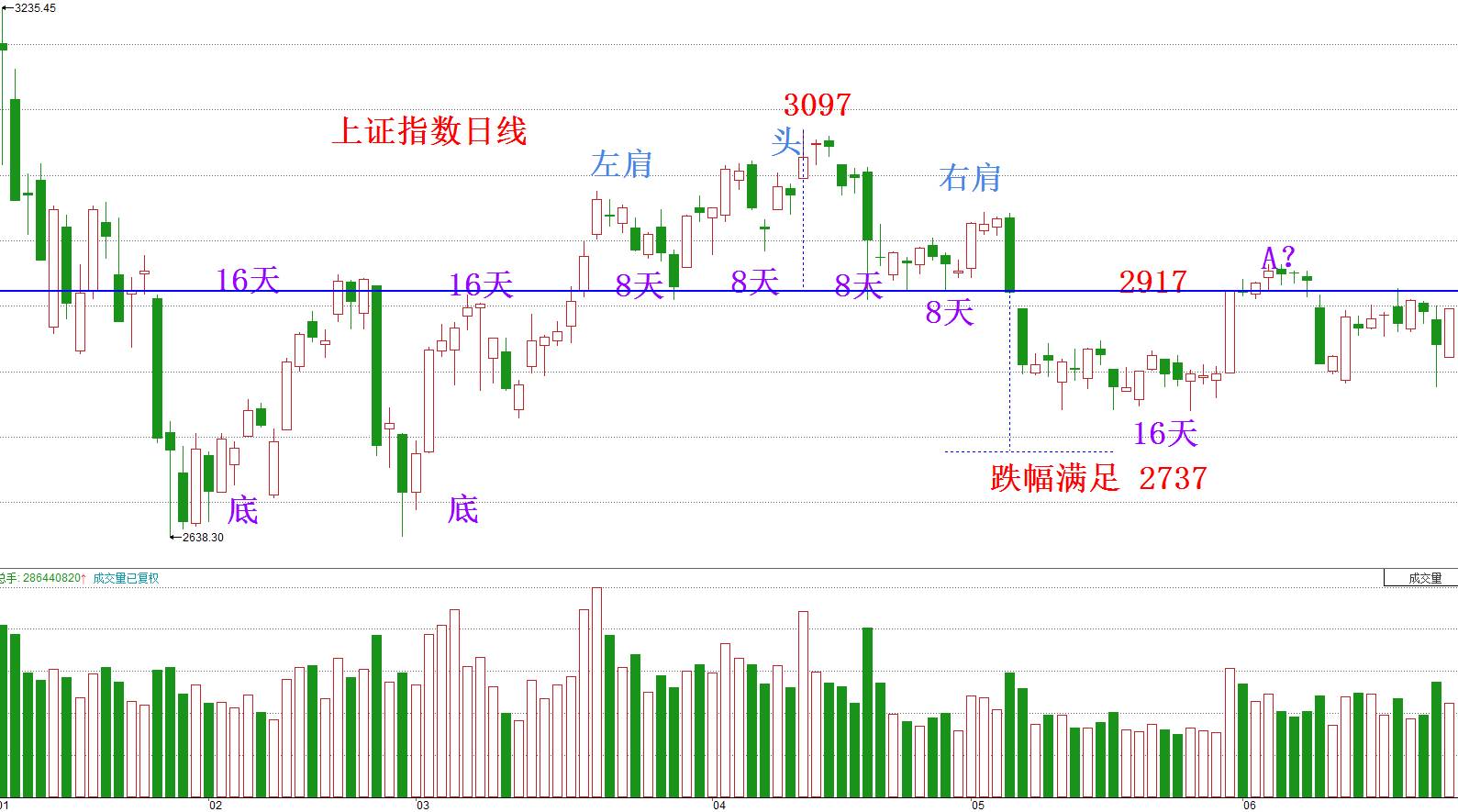 以今天收盘价2895点而言,2920其实已经是近在眼前了。对于明日的走势,大家首先要观察开盘价,宜高开不宜低开。其次如果上证指数涨至2920点一线以上时,须关注成交量变化。成交量与今日持平或温和放大是可以的,但倘若急剧放大,那就要特别小心了,它很有可能是遇到了大量的套牢盘抛压。你看上图中B点的成交量也不大的,真正持续放量是在过1213点头部时才放量。