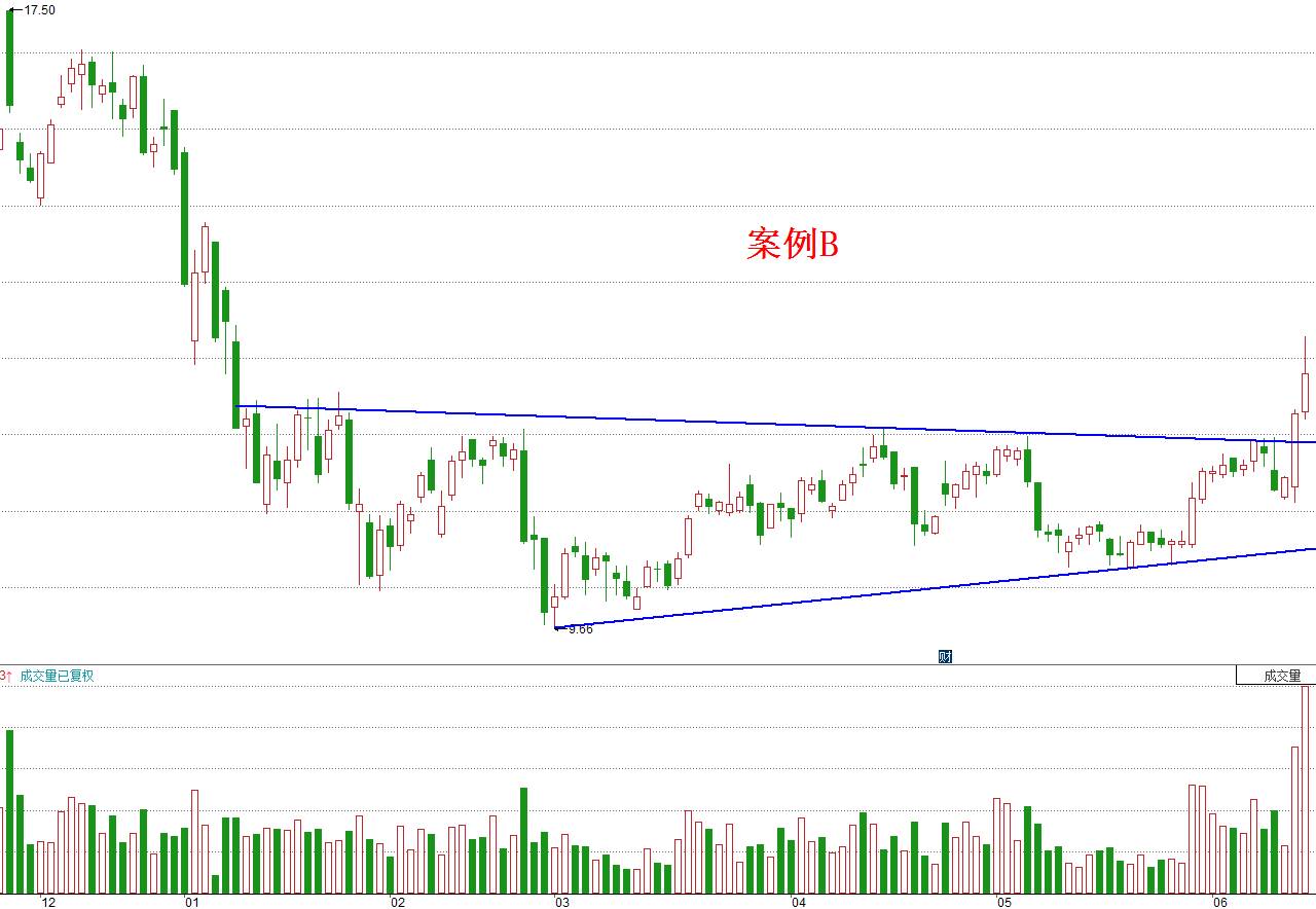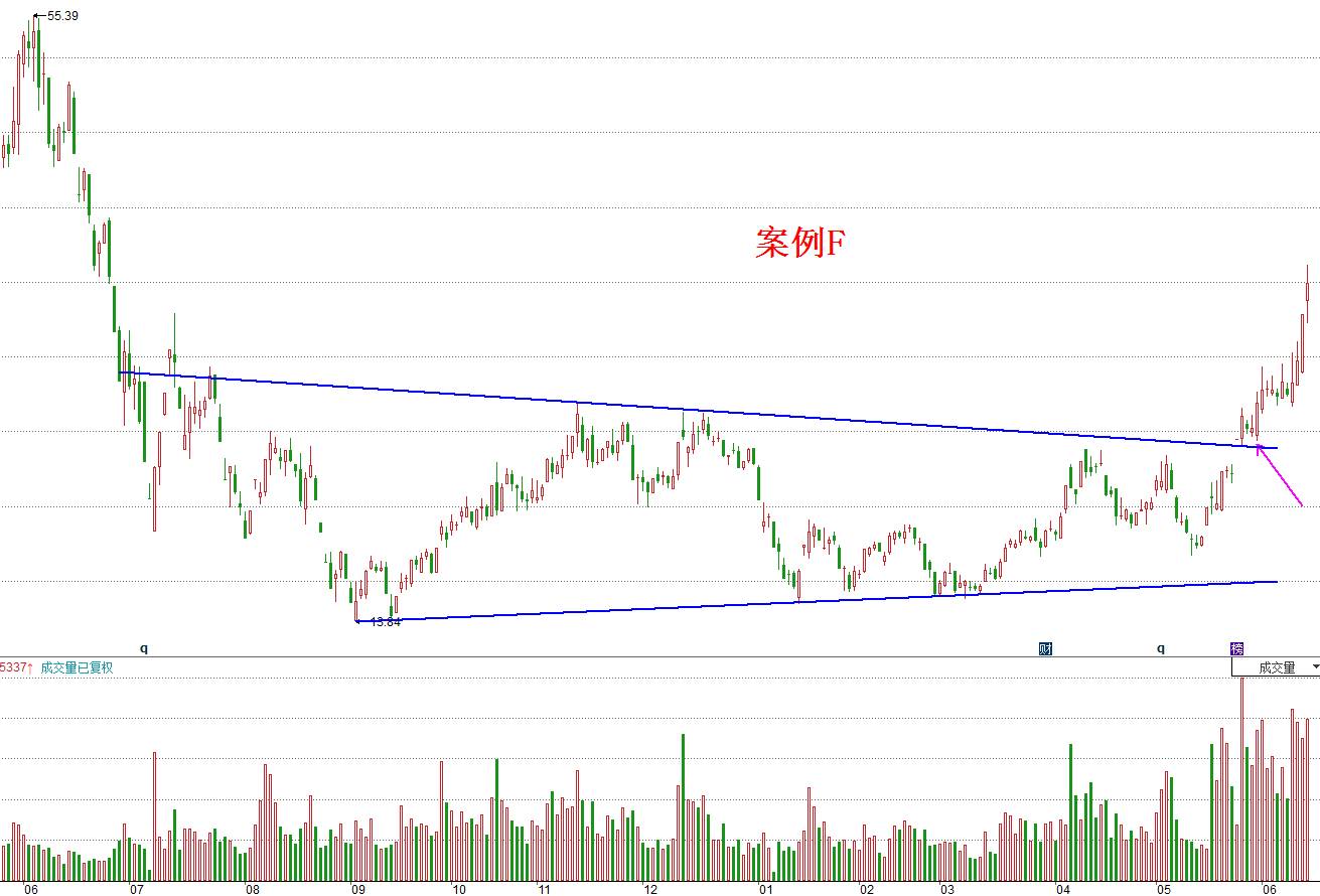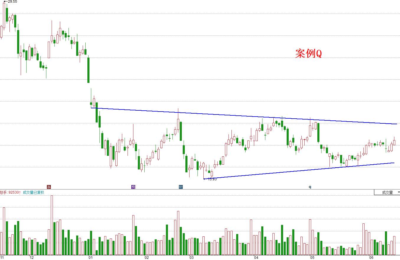 从上图中可以看到,案例Q似乎也是在做类似的三角形底部,只是它距离颈线位置尚远,现在成交量也很低迷。相对于案例F的“过”来说,案例Q的现状是“不及”。未来它会放量突破颈线吗?对此我也不能确定。如果大盘接下来走势疲软,可能它就继续盘整下去了。如果大盘接下来走势凌厉,那它就有可能对颈线发起冲击。所以,你有必要因为错过案例B今天的上涨而懊悔吗?你有必要担心自己会踏空牛市吗?真到牛市来的那天,会有一个接一个的股票突破底部而持续拉升,关键是你要有本事、有准备。