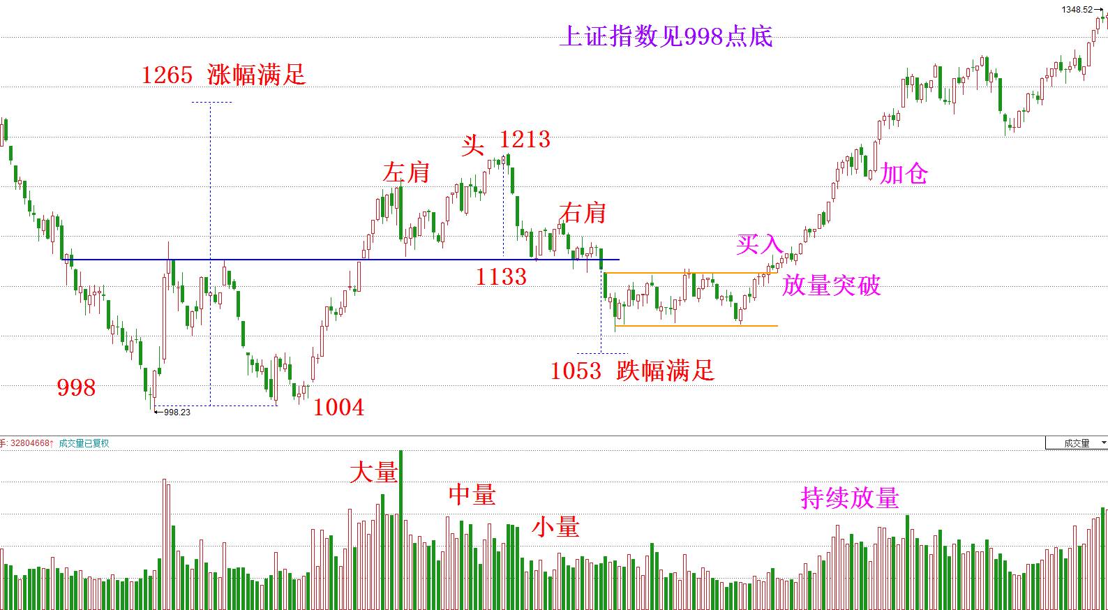 最终,上证指数最低下跌至1067点,而后构筑了一个矩形的底部。待到指数放量突破矩形底部上沿,这才是真正值得进场买股票的时机。之后,上证指数继续放量上涨,越过1213点的前高后进行回踩,紧接着再次放量上攻,此时即可基本确定一波的大行情的开始,投资者届时可以加仓。