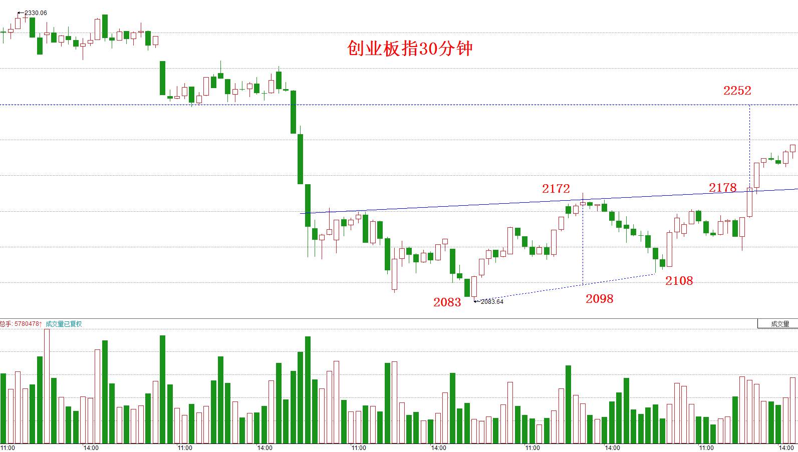 创业板指的30分钟线构筑的是一个类似双底的结构,由此我们可以计算出它的目标涨幅为: