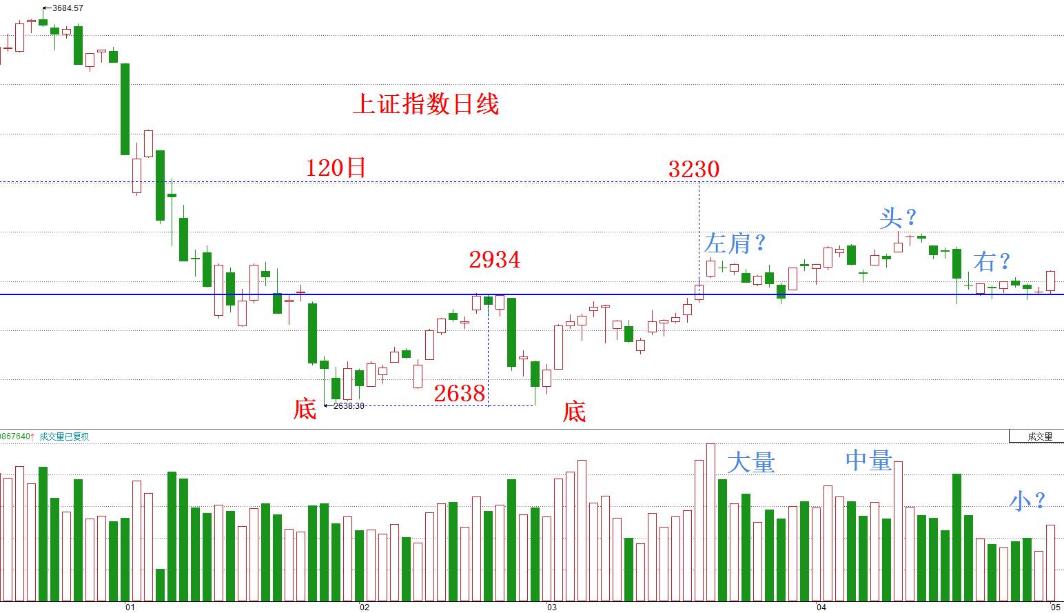 在昨天的股市前瞻中,姚尧提到:“如果指数接下来如愿反弹,则需密切关注其成交量的变化。如果成交量持续放大,则新一波上涨行情极可能就此展开。如果成交量无法持续放出,则需要提防未来会演变成头肩顶。”今天上证指数近2000亿的成交量,较昨日固然是明显放大,但较图中所标示的“左肩”和“头”的位置仍然是要小得多。因此,接下来几个交易日读者务必高度关注成交量的变化。从形态的角度看,现在很像是在构筑右肩,如果成交量无法持续放大,需要高度警惕头肩顶成型之可能。