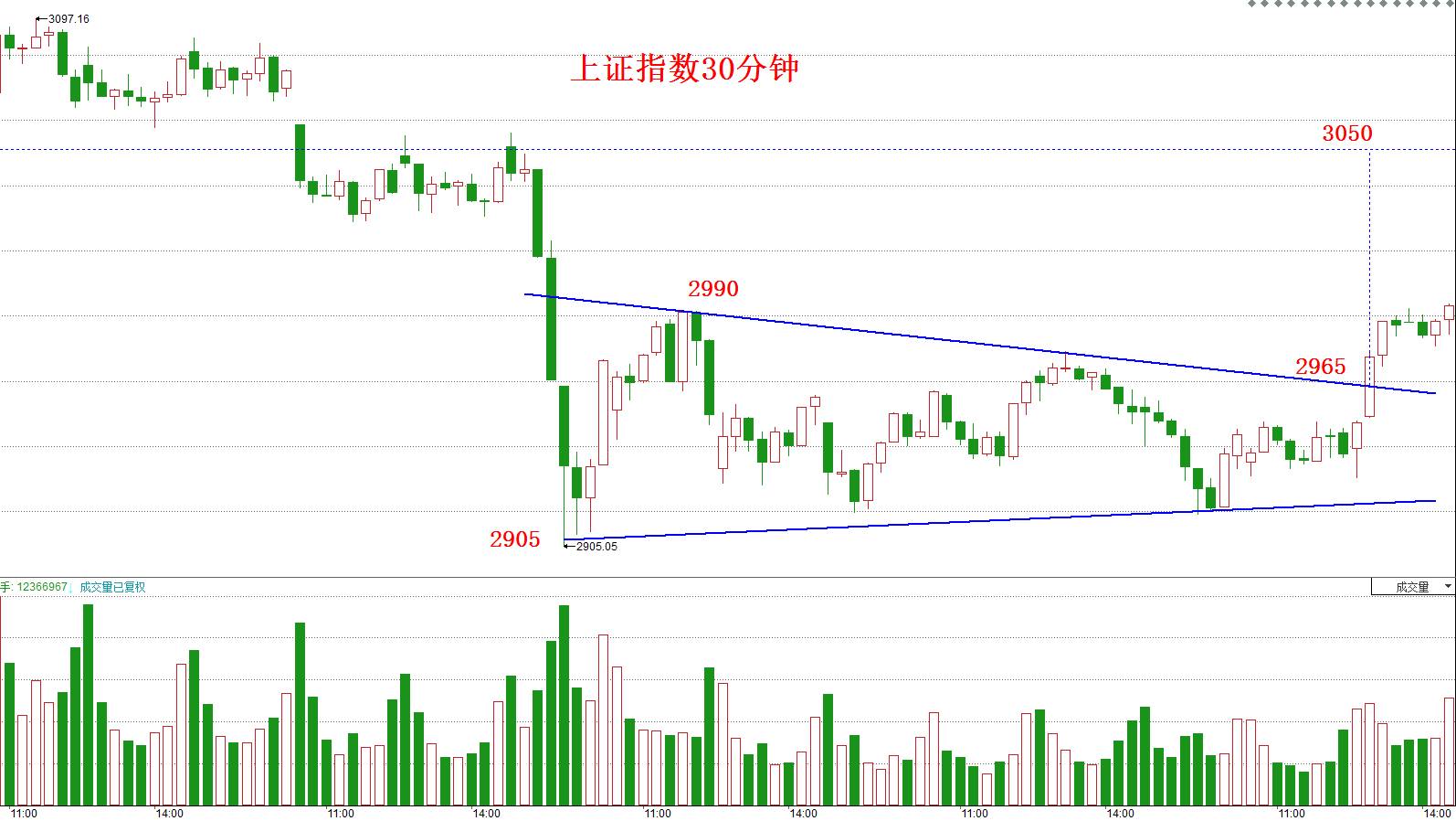 先说主板。在昨日的股市前瞻中,姚尧提到:“从过去的经验看来,每次上证指数的成交量萎缩到极致后,都会出现一波反弹。因为成交量萎缩到极致,表明愿意卖股票的人已经非常少了,很容易就拉起来。”果然今天上证指数就出现强力反弹,先看下面这张上证指数30分钟线图: