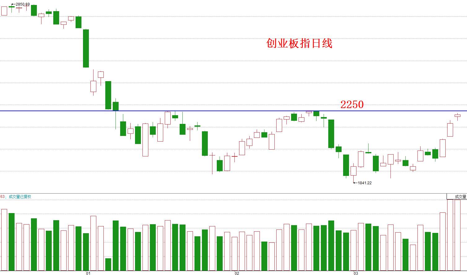 第一,现在看起来,创业板指和上证指数一样都是在构筑双底,其颈线位在2250点。如下图所示: