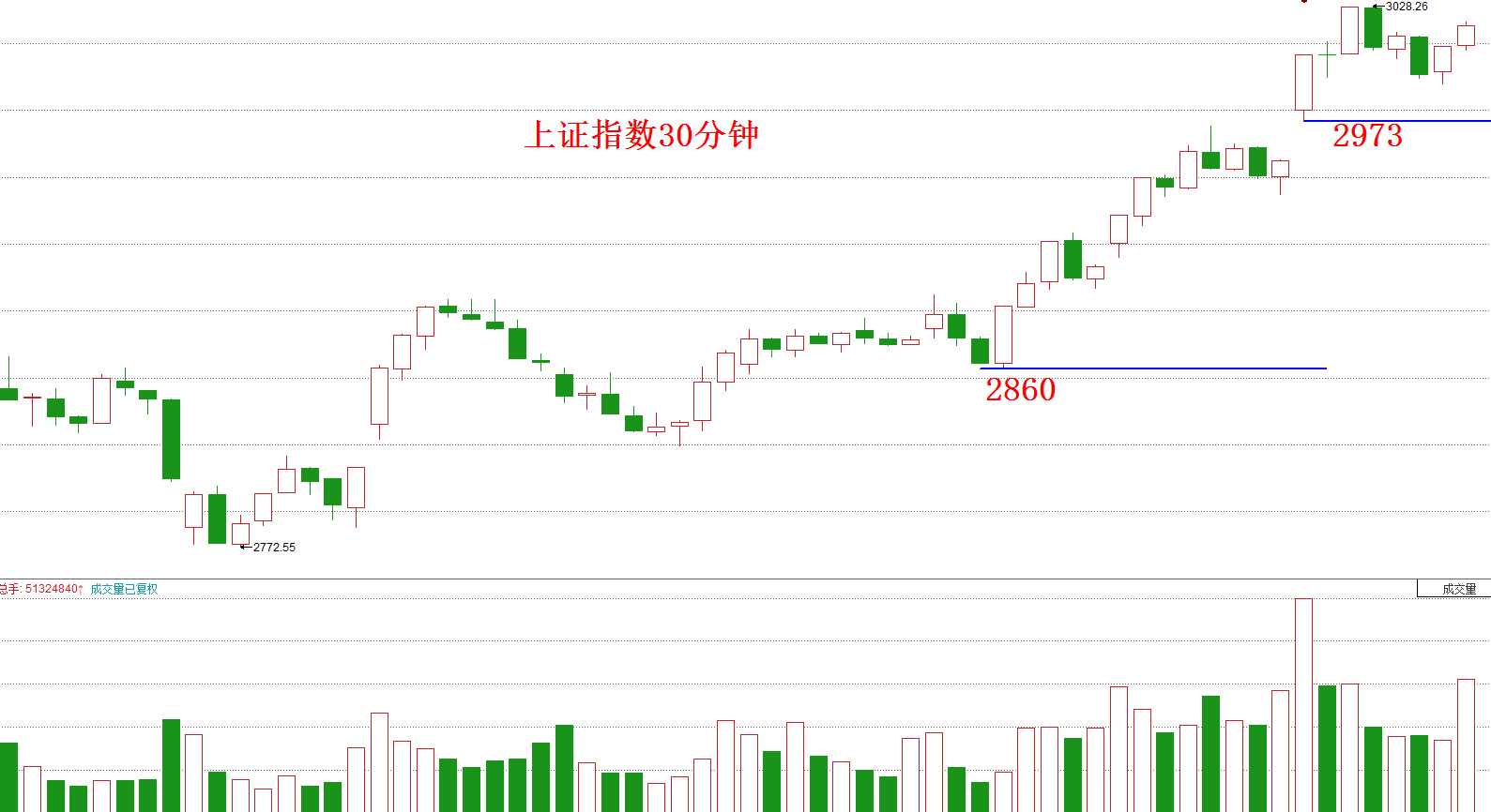 今日上证指数跳空高开,且第一个30分钟放出巨量,最低位为2973点。是以我们可以将短线止盈位由此前的2860点上移至2973点。只要不有效跌破2973点,则短线多头结构完好,投资者可继续持股。如果指数跌破2973点,乃至于封闭了今天的跳空缺口,则短线投资者可酌情减仓。