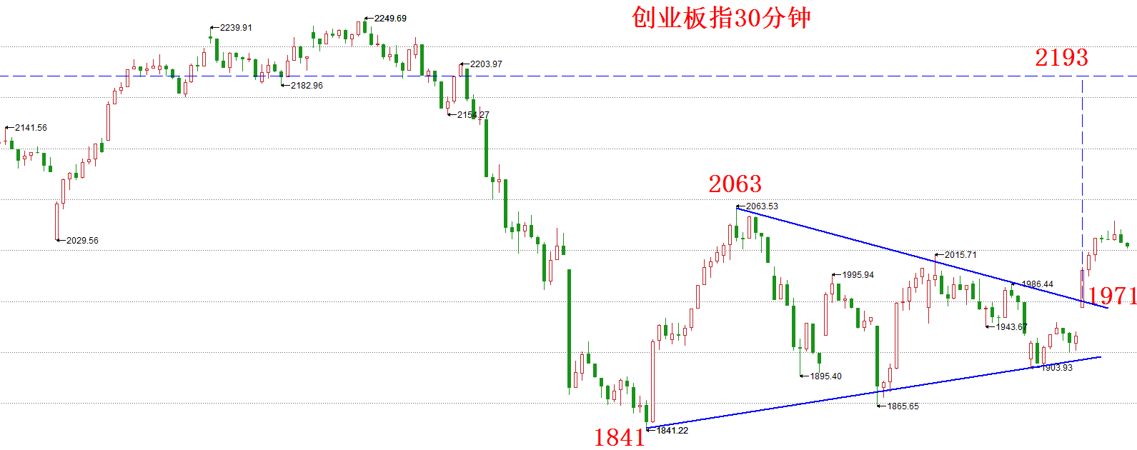 可以看到,创业板指今日以跳空高开的方式突破了三角形底部的颈线,突破的位置在1971点,则创业板指的第一目标涨幅为: