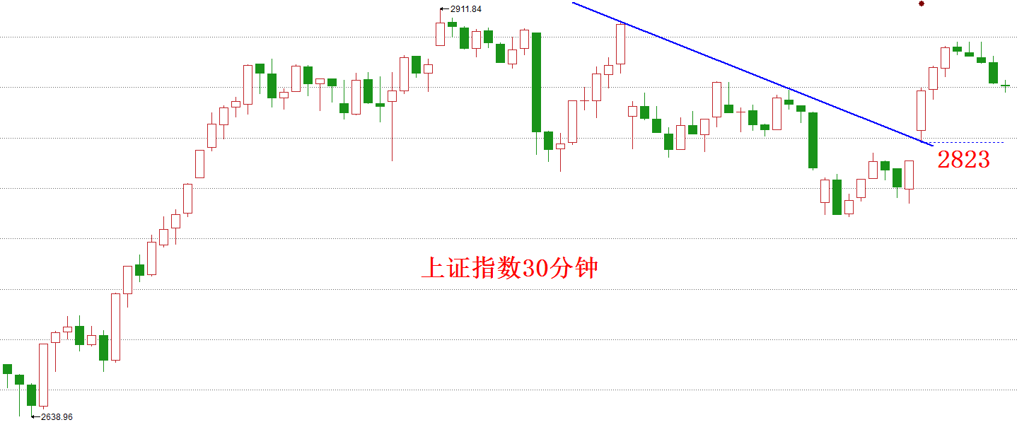 可以看到,上证指数今天跳空高开后有个回踩,回踩的最低点位在2823点,同时也是前期两个高点所形成趋势线的位置,是以这个点位会形成较强支撑。因此,我们之前一直是将破底翻突破时的2785点作为多头止盈的支撑,现在这个止盈位可以提升至2823点了。只要上证指数不有效跌破此点位,则短线多头结构仍未改变,短线投资者可以继续持股。一旦指数有效跌破2823点,乃至于将今日至跳空缺口封闭,短线投资者可酌情降低仓位。中长线投资者则仍可继续忽视波动。