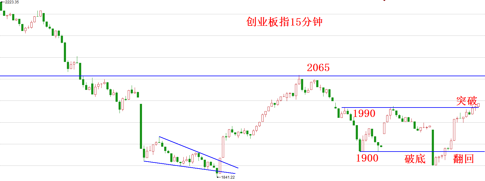 可以看出,创业板指今日在15分钟线图上形成破底翻。现在的问题是,尾盘的突破算不算有效突破?这还需要看明天的指数表现。如果明天创业板指可以发力上攻,则按照等幅计算创业板指未来有望上攻2080点。而从更大的视角来看,创业板指15分钟线现在是在构筑双底,一旦突破2065点的颈线位后,目标可以上看至2280点一线。当然,以上都还只是构想,具体行情如何演变,我们还需要边走边看。