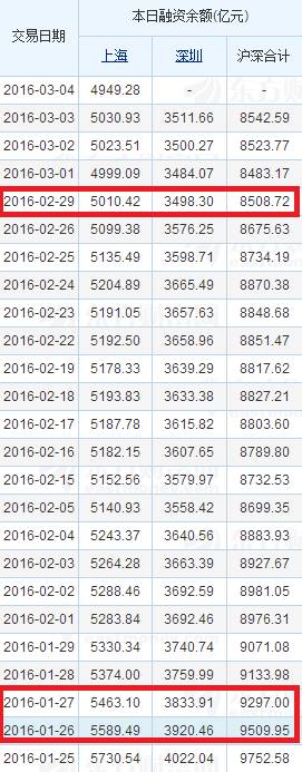 我们先看上证指数。沪市在股灾2.0时融资余额最低点是9月30日的5651元,今年1月26日时降至5589亿元,再度创出新低。但由于指数也已经创出新低,所以就无所谓什么底背离了。1月27日,上证指数创出2638.30点,融资余额降至5463亿元。之后上证指数虽有反弹,可融资余额却是持续萎缩的。2月29日,上证指数最低点降至2638.96点,叫前期低点仅高半点,但融资余额已经萎缩至5010亿元。指数未能创出新低,而融资余额不断萎缩,这就是底背离,指数出现强力反弹也就不奇怪了。