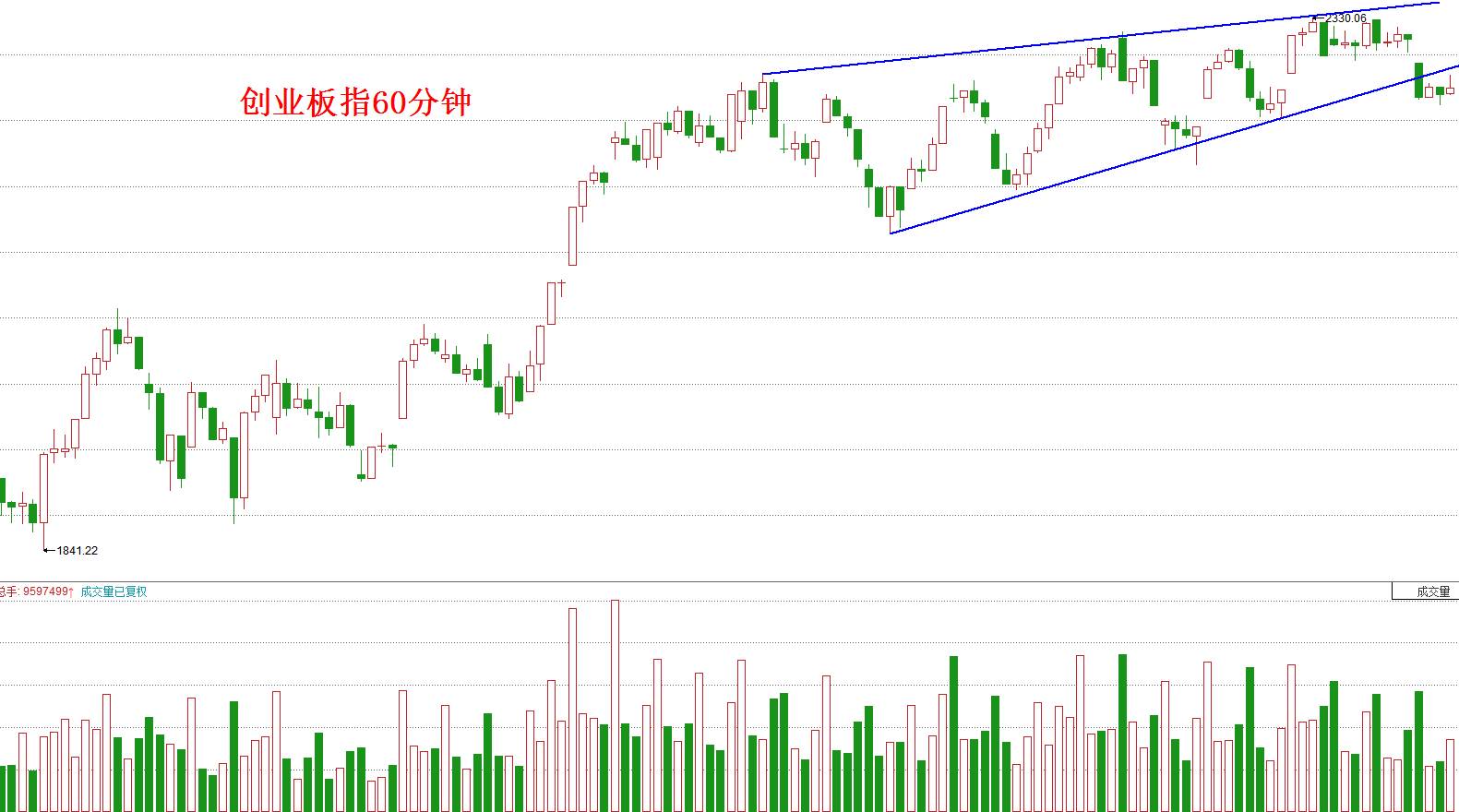 在过去几天的文章中,姚尧一直提到现在创业板指是在走上升楔形,并且说“如果指数能够放量向上突破颈线,或许我会考虑追加买进,但在此之前仍是以谨慎观望的态度应对。”很不幸地,今天创业板指第一个小时就低开低走跌破了下颈线,之后的反弹也没有站回到下颈线之上,是以我们仍然是维持谨慎观望的态度,不因为其下跌而“抄底”。