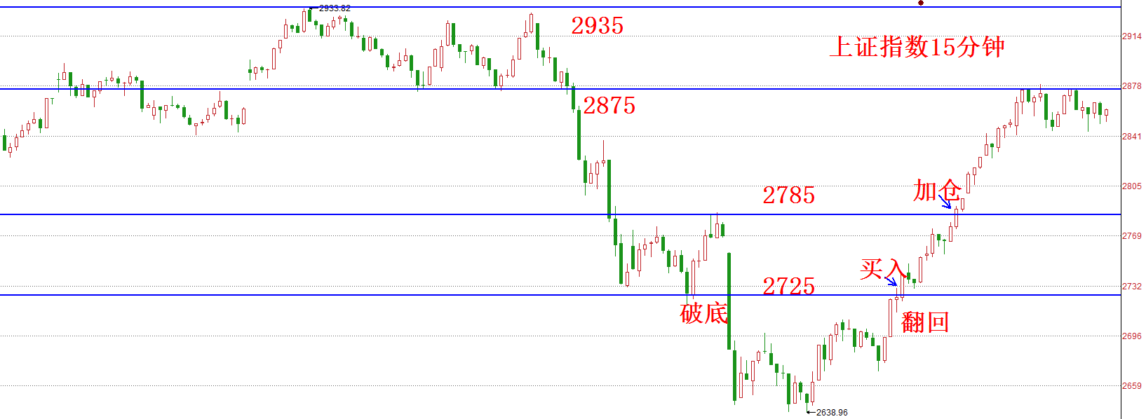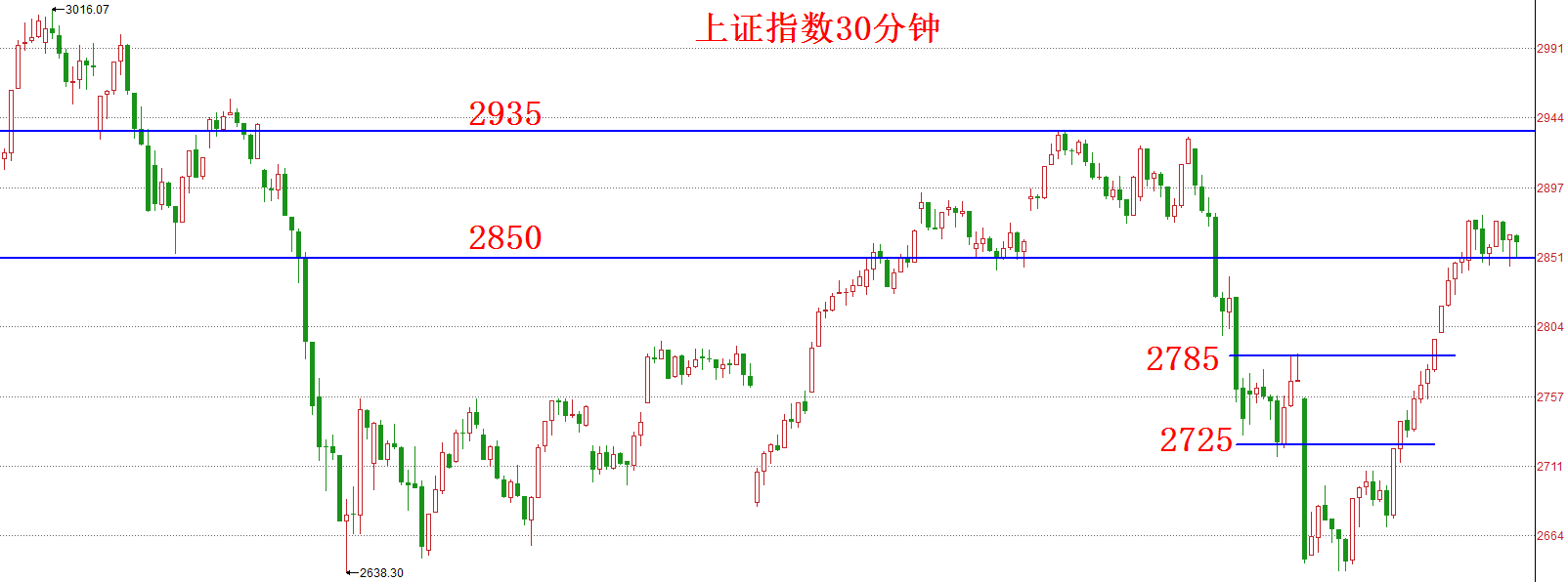 我们可以看到,上证指数在2875-2935点之间有不少套牢盘,所以今天指数多次反弹到该点位遇阻也是非常合理的。如果指数今天就发力强行攻击此套牢区,反而容易陷入后续乏力的困境。我们不妨设想一下此区间套牢投资者的心理:假设投资者是在2900点附近买的股票,当指数跌到2638点时,投资者心理无疑是极度痛苦的,其中一部分人扛不住而终于在低位割肉出局了。之后大盘在最近三天出现了强力反弹,那么对于2900点买入而始终未曾割肉的投资者,他们会怎么想?他们盯着自己的股票账户由亏25%缩小到亏15%,又缩小到亏5%,他们这时候想的是,只要在往上加一把劲,我套牢的股票就可以解套赚钱了!如果今天上证指数再次大涨而突破2935点的短期前高,则2900点左右套牢的投资者通常会先卖出一小部分仓位,看指数涨多了再卖出一小部分,但他通常不会全部卖出。也就是说,经历过这样一波杀跌后,那些前期套牢的投资者不但能够赚钱,而且还能紧紧抱住盈利的筹码,这显然是主力所不能允许的,因为以一轮行情的整体来看,散户赚的就是主力亏的,散户亏的就是主力赚的。那么,主力应该怎么做?