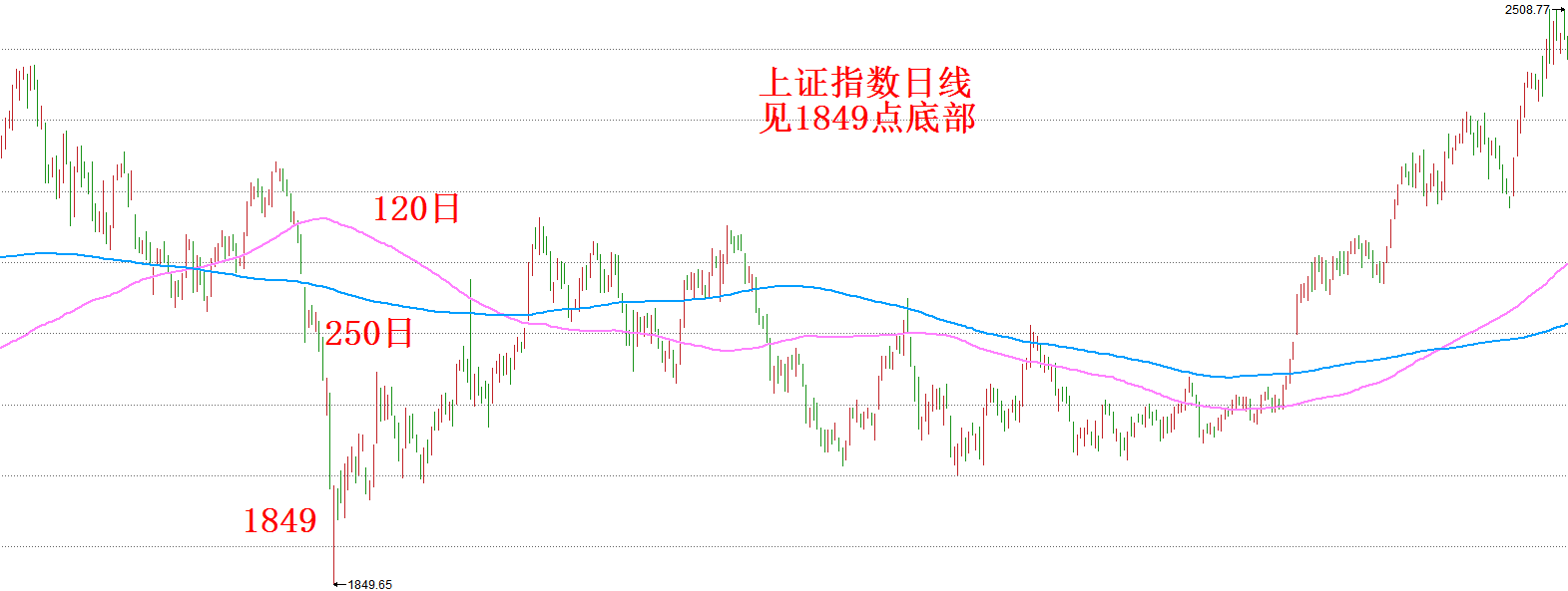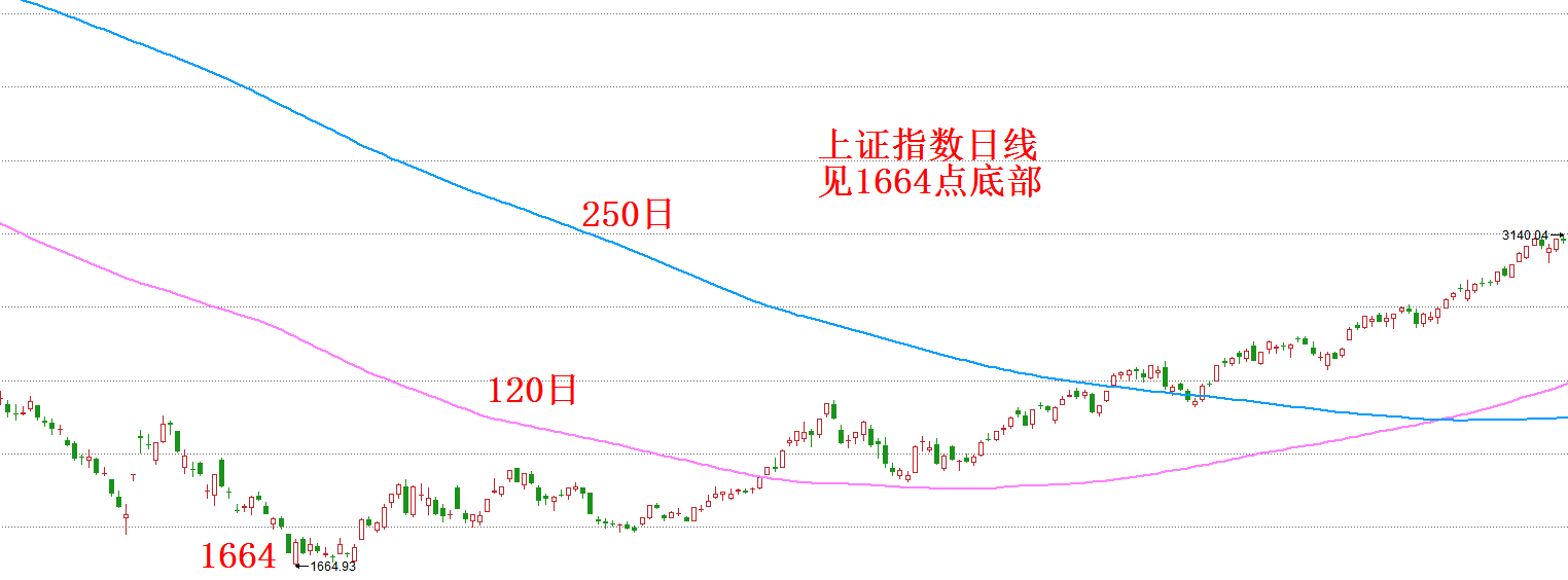 可以看到,上证指数在创出1849点底部后每次反弹到半年线或年线附近时就出现回落,但回落的点位再也没有跌破过1900点,指数就这么低位震荡了一年多筑底,直到2014年7月指数发力上攻突破半年线和年线,并随即带动半年线和年线拐头向上,这才开启了一波轰轰烈烈的大牛市。