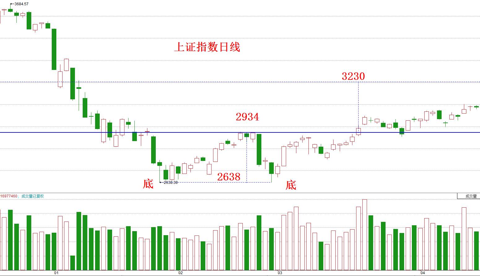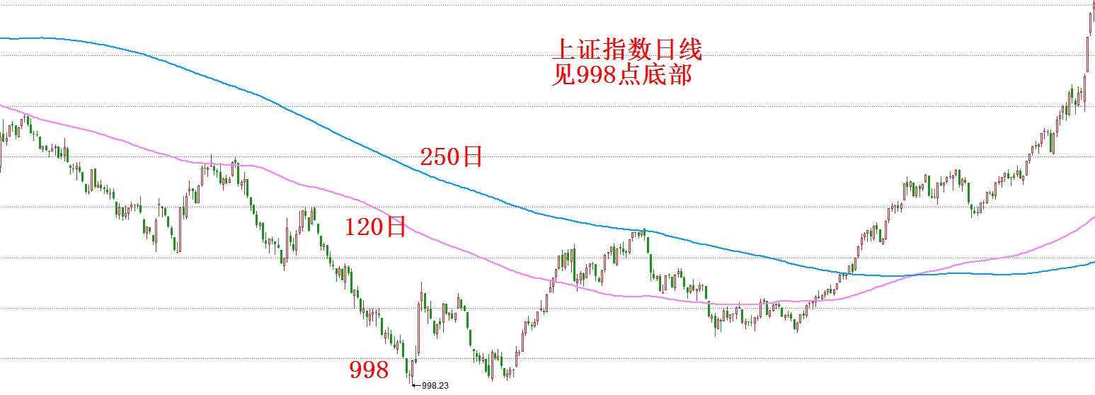 可以看到,上证指数在创出998点的底部后确实没有再创新低了,但它有没有立刻一路狂飙呢?它先是反弹回落后在1000点附近再做了个底(颇类似于现在的2638),然后一路上涨冲破半年线时出现小幅回调,再涨至年线处时出现大幅回落。经过一段时间的盘整,待指数重新站上半年线和年线,且半年线逐步拐头向上时,指数开始快速拉升。